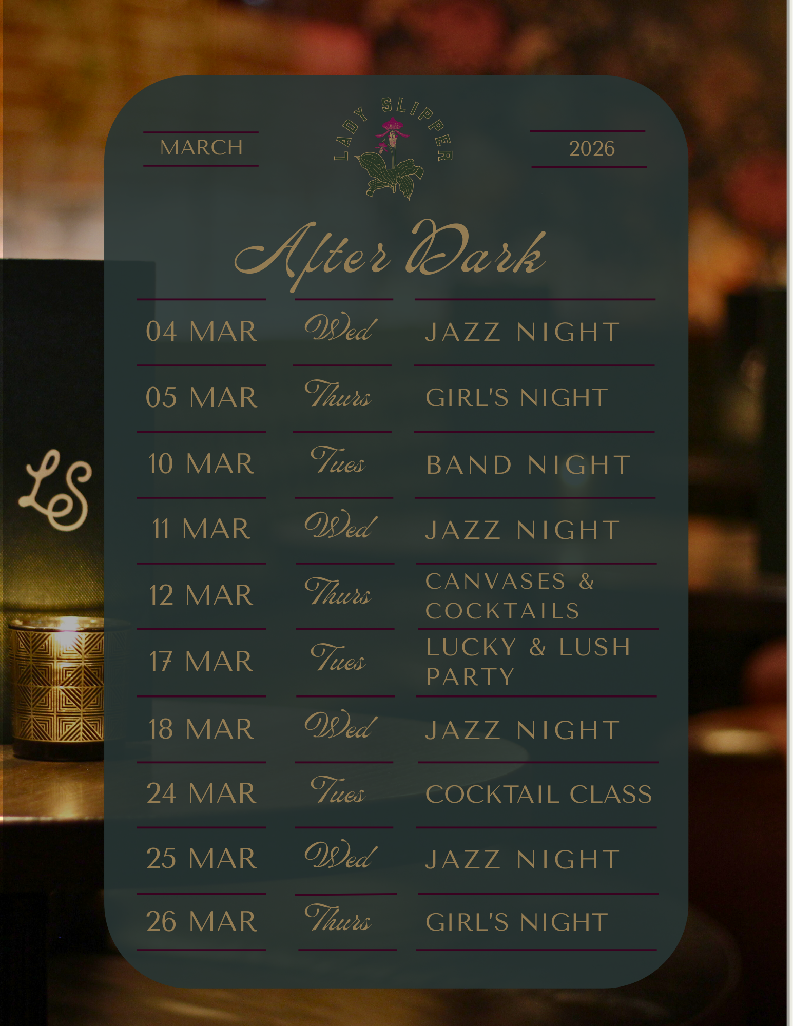 Slide 1 Slide 1 (current slide) Slide 2 Slide 2 (current slide) Slide 3 Slide 3 (current slide) Slide 4 Slide 4 (current slide) Slide 5 Slide 5 (current slide) This Month at Lady Slipper Join us for award-winning bites & cocktails, world-class art, live jazz, or any of our other events happening this month. We’d love to see you. Events at Lady Slipper “I have no words. You must go here if you’re in Bentonville.” View Menu Featured In